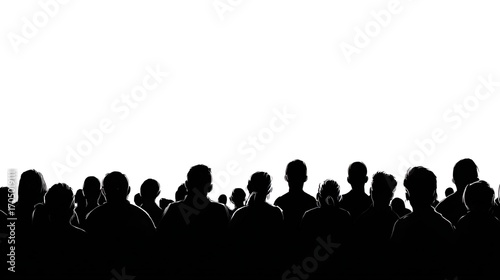 minimalistic silhouette of theater audience heads lined along the bottom edge of a pure white background, solid black shapes with no shadows or gradients, crisp clean edges, high