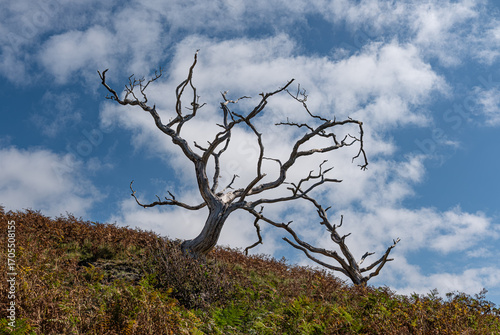 Totholz in bizarrer Form – alter Baum mit mystischer Ausstrahlung auf Hügel, aufgenommen bei dramatischer Witterung und kontrastreichem Licht