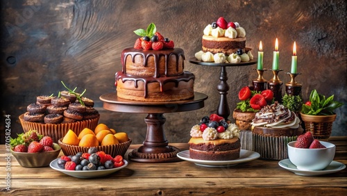 A decadent assortment of chocolate cakes, pastries, and fresh fruit arranged on rustic wooden surfaces, illuminated by flickering candlelight