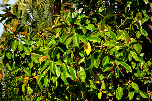 fikus sprężysty rosnący w ogrodzie, dziko rosnący fikus sprężysty, figowiec sprężysty, Ficus elastica, ficus elastica leaves close-up, rubber tree, ficus elastica growing in the garden close up