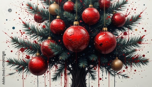 Artistic Yuletide Expressive Christmas Tree with Dramatic Red Paint Textures Suggesting Festive Ornaments