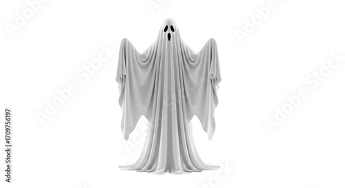 Isolated spectral ghost against a bright backdrop shrouded in draped fabric with eye holes