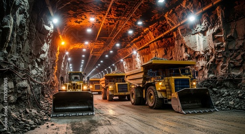 Industrial operation with a fleet of heavy dump trucks and a bulldozer working deep inside a modern underground mine