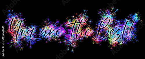 Kolorowe zimne ognie i fajerwerki układające się w kształt słowa YOU ARE THE BEST! w języku angielskim.