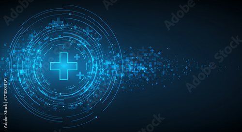 Digital healthcare technology, abstract medical cross icon with a futuristic and technological background, concept of medicine and health.