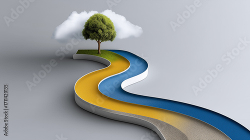 Path to Growth: An abstract image of a vibrant path winding its way towards a lush tree and a fluffy cloud, a metaphor for growth and new beginnings.