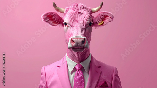 Whimsical pink cow in sharp business suit exudes confidence and unique style for modern branding