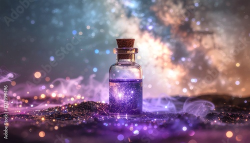 A glowing miniature vial floats magically in the depths of cosmic space.