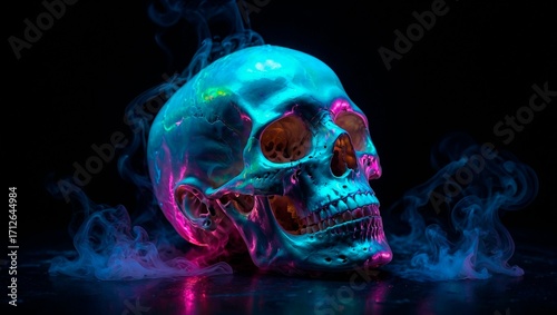 Shiny metallic human skull. Pink and blue neon lights on a dark surface, obscured by swirling white smoke. Eerie, mysterious atmospheric death concept wallpaper illustration.