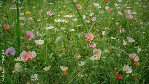 Colorful summer illustration featuring wildflowers and green onions with pink and white poppies in lush grass, painted in an impressionistic brushstroke style. Seamless pattern design.
