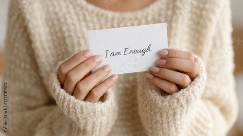 Close up of hands holding a card with inspirational message "i am enough" for motivation and self-esteem
