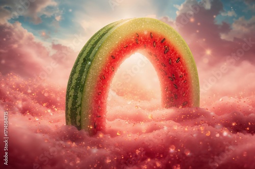 Watermelon rainbow bridge glows magically against surreal dreamlike night sky