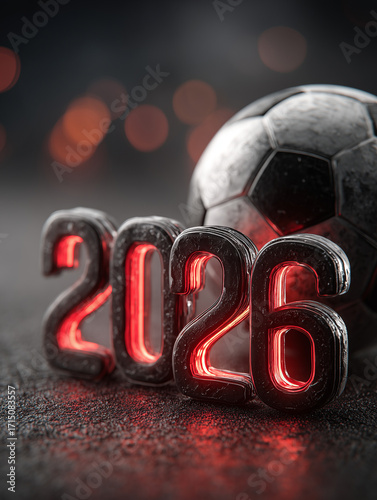 Napis "2026" w surowej, metalicznej formie, oświetlony od środka czerwonym blaskiem, stoi obok piłki nożnej na ciemnym boisku.