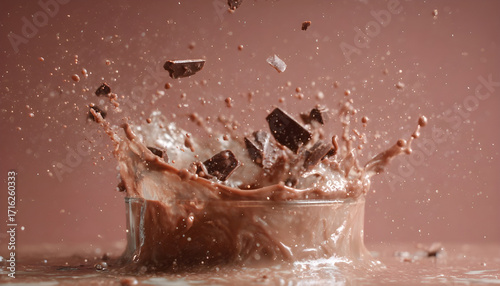 Chocolate pieces falling in milk with chocolate glass in slow motion
