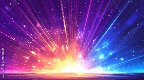 カラフルな光と粒子が爆発する、輝く放射状のデザイン