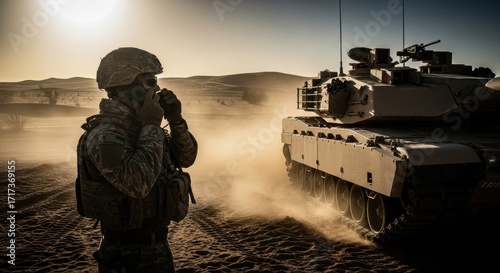 Soldier in desert communicating with radio. Military man near tank dust. War veteran in action during combat operation as army concept.