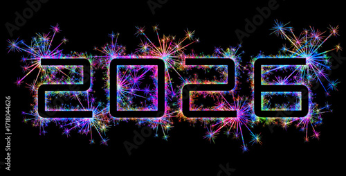 Kolorowe zimne ognie i fajerwerki układające się w kształt liczby 2026.