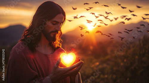 Close-up of Jesus holding a luminous heart, with distant mountains bathed in warm sunset hues and flocks of birds flying overhead