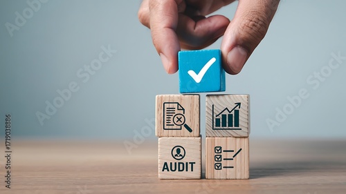 Hand places a blue block with a white checkmark on top of wooden blocks representing business concepts like audit and growth