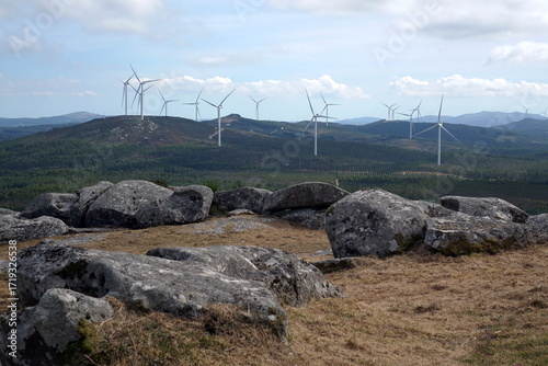 Parco eolico su colline rocciose, turbine a vento che generano energia pulita in un paesaggio naturale Miradoiro das Tres Rías