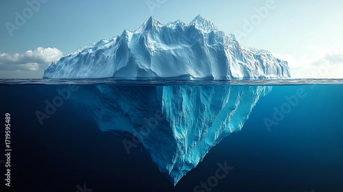 Dramatic iceberg floating in deep blue ocean waters, a symbol of hidden potential and environmental challenges, inspiring awe and concern in viewers