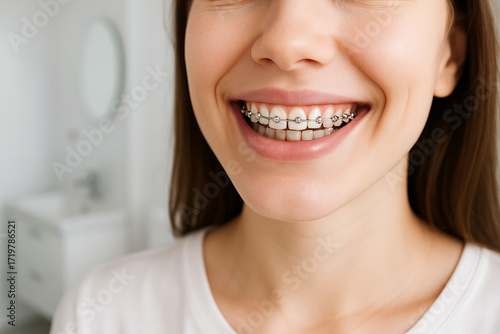Smiling young woman with braces displaying dental care and confidence in a bright setting. concept of orthodontics, self-esteem boost, healthy teeth