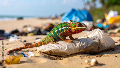 medio ambiente, ecología, camaleón, protección, conservación, campaña ecológica, sostenibilidad, responsabilidad, ONG, planeta, vida salvaje, contaminación, residuos, basura, reciclaje, concienciación