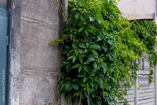 Winobluszcz pięciolistkowy obficie porasta betonowe ogrodzenie. Soczyście zielone pnącza oplatają fragment betonowego ogrodzenia, tworząc gęstą, naturalną powłokę. Beton ma szorstką, teksturowaną pow