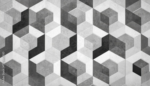 Abstract geometric pattern of interlocking 3D hexagons in grayscale
