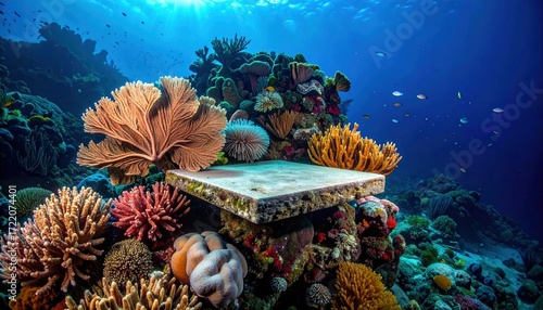 A vibrant coral reef ecosystem flourishes with diverse marine life under blue ocean light.