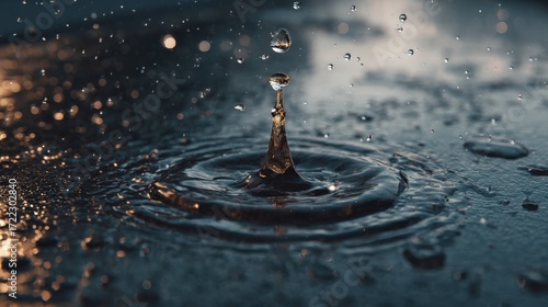 A captivating close-up of a water droplet impacting a dark surface, showcasing intricate ripples and surrounding splashes.