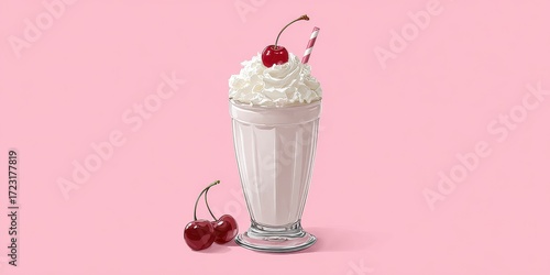 Classic Milkshake: A refreshing milkshake, topped with whipped cream and a vibrant cherry, sits in a vintage glass against a solid background. A nostalgic treat for any time.