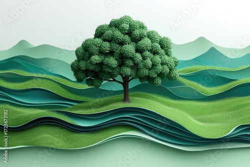 A single tree on layered grass, with soft green hills. Ideal for nature, environmental, or peaceful themes.
