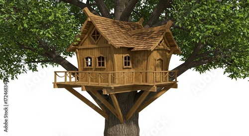 Wooden treehouse amidst leafy branches elevated on sturdy supports against a white background