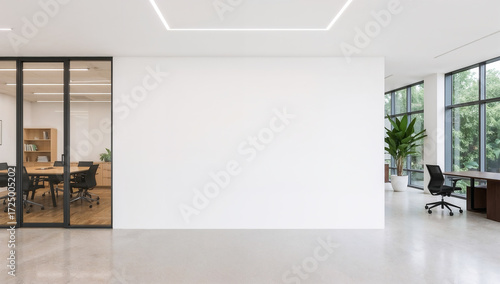 Business abstract background of a clean, minimalist modern office interior featuring a large uninterrupted white wall, centered and ready for company logo, branding, or corporate signage