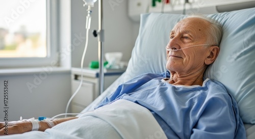 An elderly man lying in a hospital bed with a nasal cannula and IV drip.