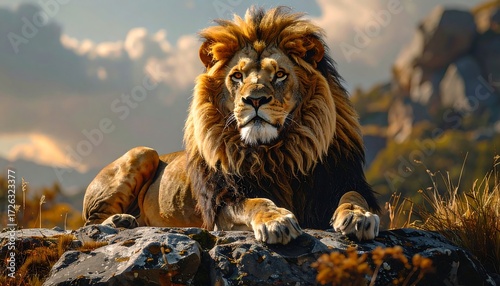 Majestic lion rests on rocky outcrop, gazing intently