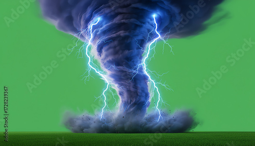 A dramatic tornado with lightning strikes projecting power and chaos against a vibrant green backdrop.