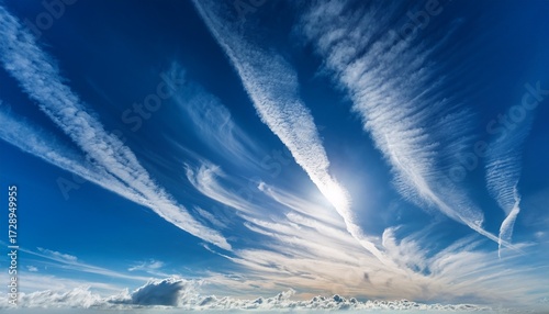against a clear blue sky there are arc shaped ribbon like cirrus clouds near the sun with fluffy cumulus clouds below showcasing the beauty of atmospheric optics and cloud forms