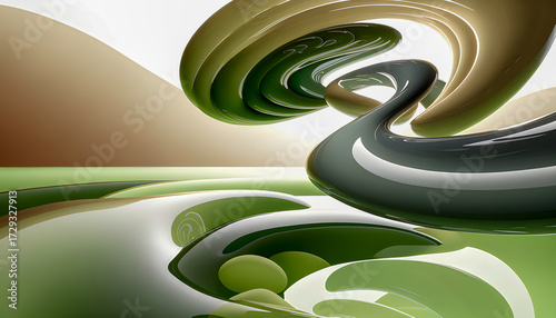 Abstract green and brown fluid landscape with glossy flowing curves resembling hills and rivers under soft light creating a surreal organic environment with futuristic design appeal