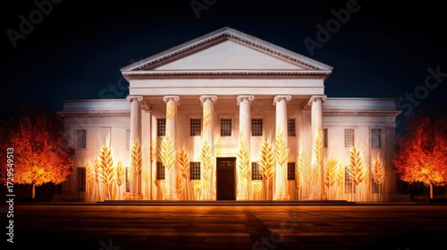 A beautifully illuminated building with grand columns and vibrant autumn trees, showcasing artistic projections on its facade at night.
