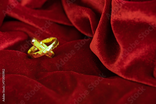 velour wedding, wedding anniversary, macro gold wedding rings on a burgundy background, pomegranate fabric, velveteen