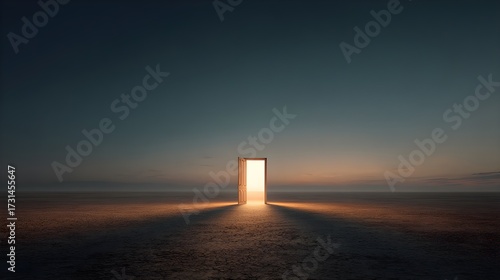 Mysterious glowing doorway in a dark landscape casting ethereal light symbolizing opportunity new beginnings and a path forward