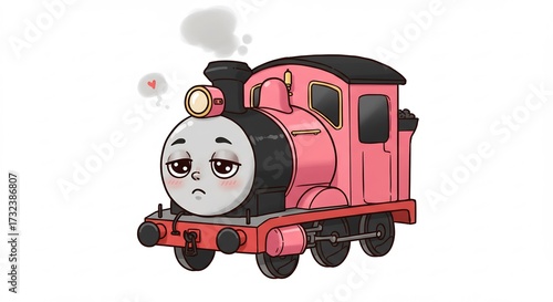 Pequeña locomotora rosa con ojos tristes y somnolientos vapor suave personaje de caricatura agotado fondo blanco