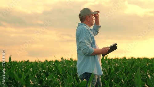 Farmer businessman working in corn field with digital tablet, agriculture. Farmer with computer tablet evaluates green corn shoots in field at sunset. Organic grain. Technology, agricultural business.