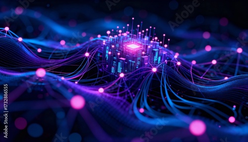 Abstract digital illustration of a central data hub with interconnected glowing networks.