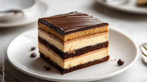 A decadent slice of opera cake featuring alternating layers of coffee-soaked sponge and ganache.