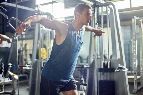 Young sporty man using cable crossover machine while having intensive workout, interior of modern gym on background