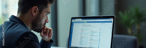 A businessman deep in thought as he evaluates various checkboxes on an online survey displayed on his laptop. The composition allows negative space for text. His concentration illustrates the importan