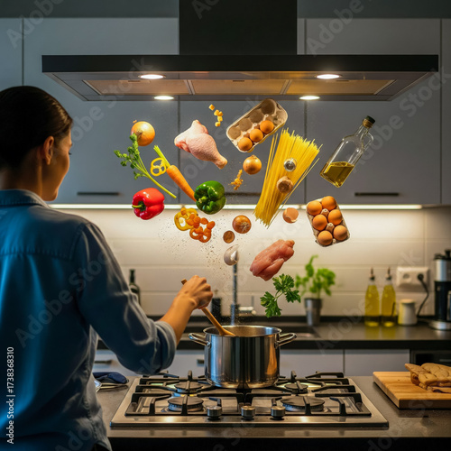woman cooking with ingredients magically floating in the air